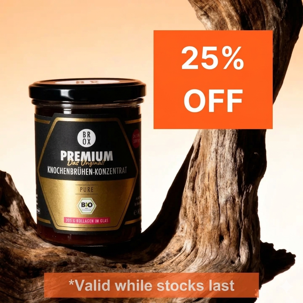 The crucial difference lies in the production process: Whilst cheap supermarket broths are taken off the heat after just 2–3 hours (meaning they contain barely any collagen), Brox simmers its organic grass-fed bones for a full 24 hours. Only then do the amino acids – glycine, glutamine, proline – fully release from the bones.