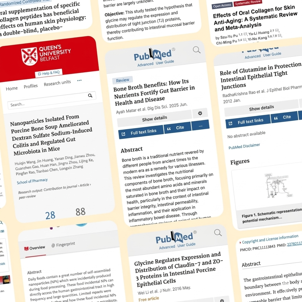 • A 2022 study (Wang et al., Frontiers in Nutrition) showed that nanoparticles from pork bone broth significantly reduced colitis (intestinal inflammation) and positively regulated gut flora.